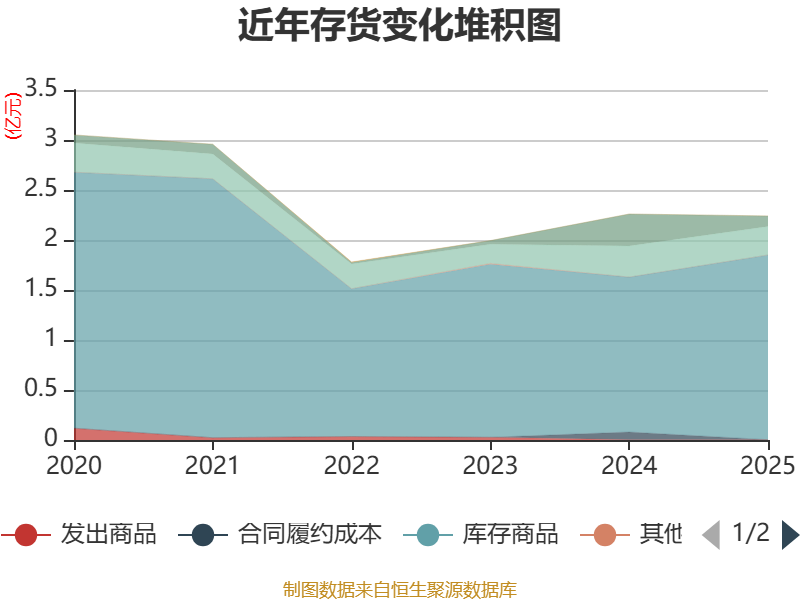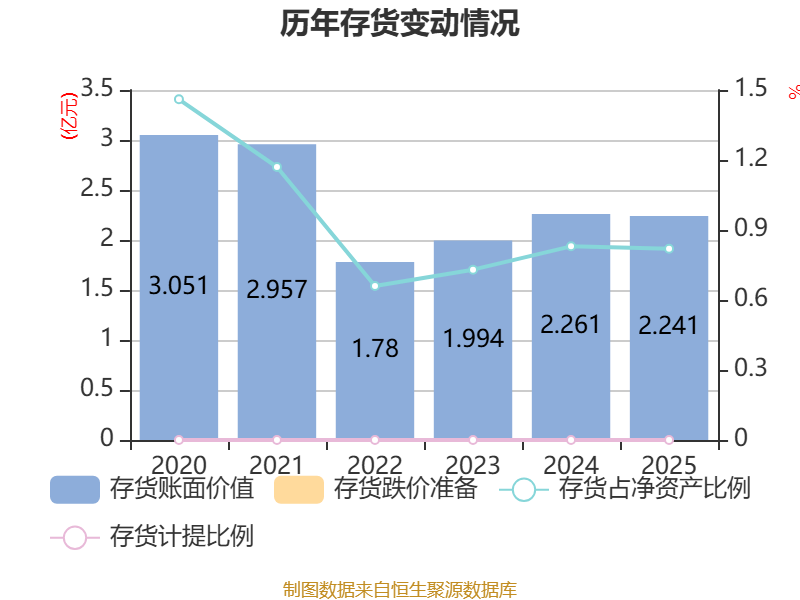 从存货变动来看,截至2025年末,公司存货账面价值为2.24亿元,占净资产的0.82%,较上年末减少196.11万元。公司本期没有计提存货跌价准备。