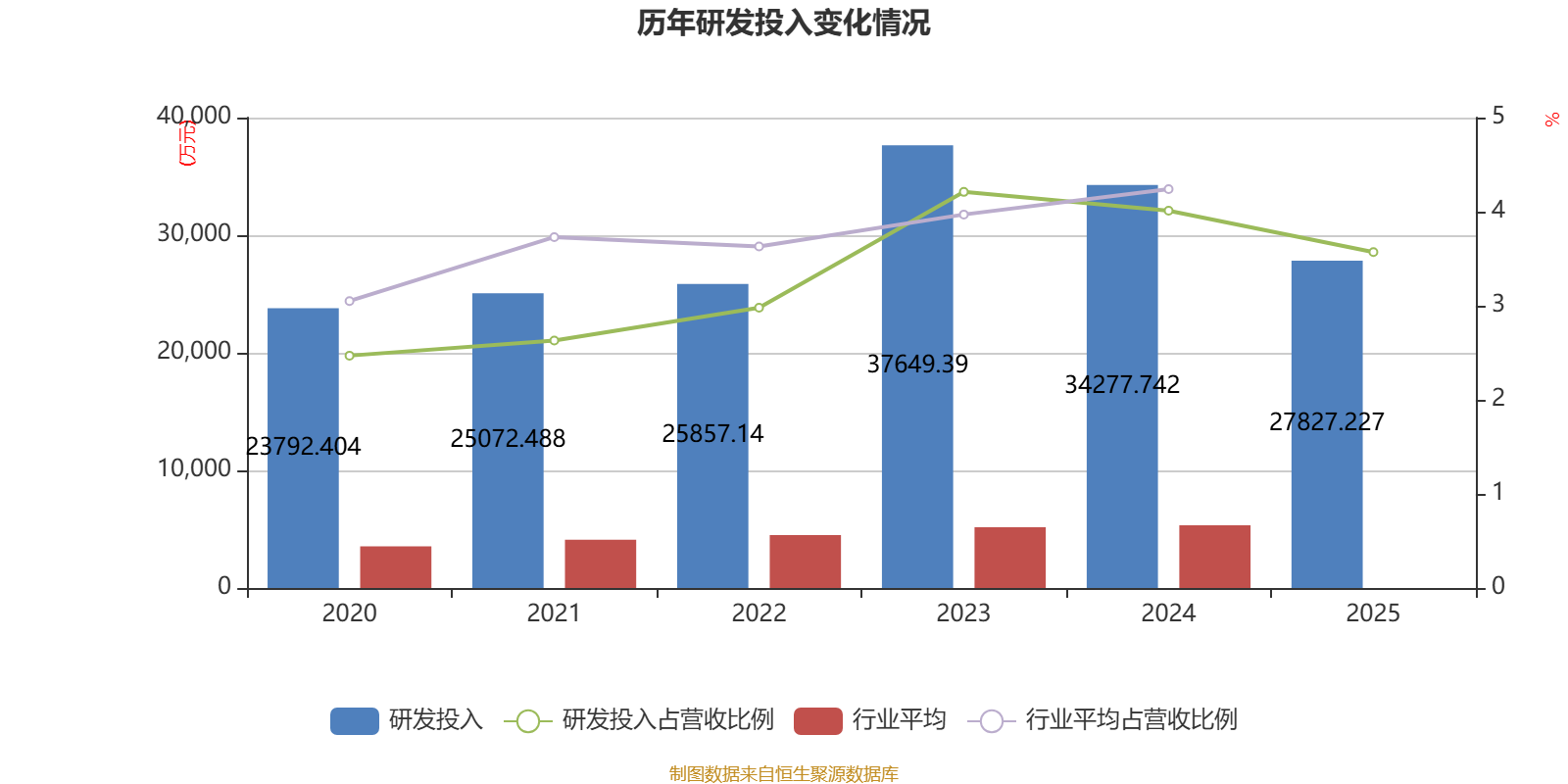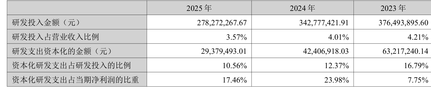 2025年全年,公司研发投入金额为2.78亿元,同比下降18.82%;研发投入占营业收入比例为3.57%,相比上年同期下降0.44个百分点。此外,公司全年研发投入资本化率为10.56%。