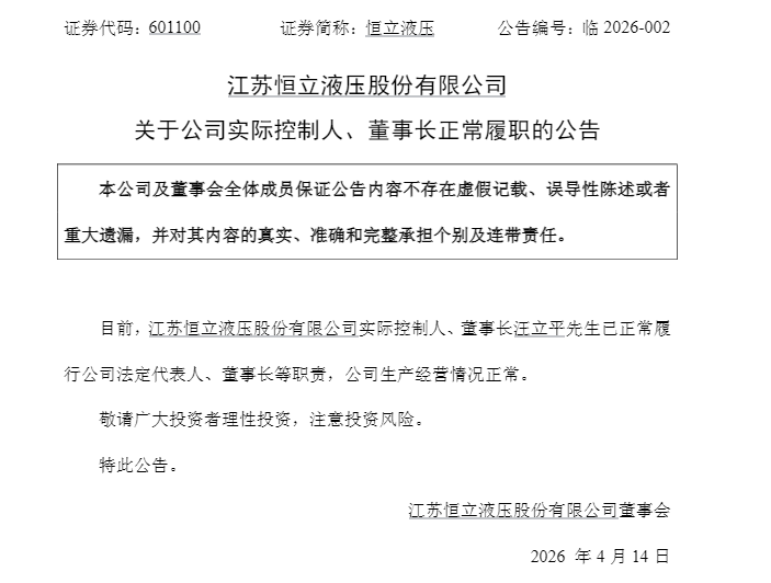 4月13日晚间,恒立液压(601100)公告称,公司实际控制人、董事长汪立平已正常履行公司法定代表人、董事长等职责,公司生产经营情况正常。