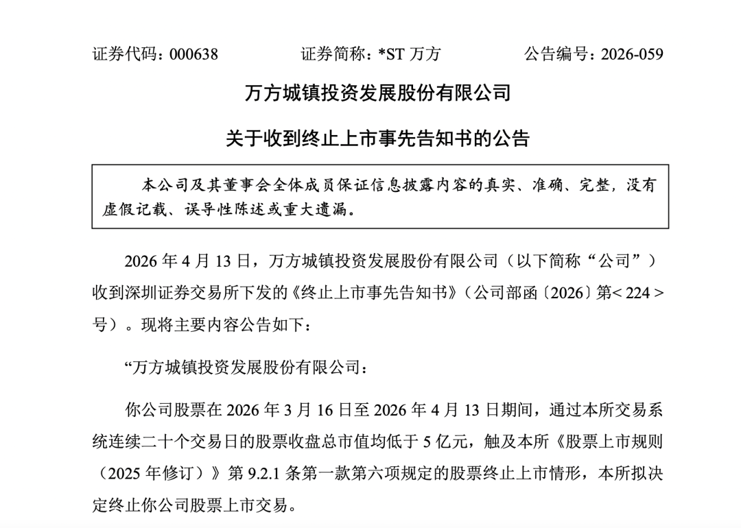 4月13日晚间,*ST万方(000638)发布公告称,截至2026年4月13日,公司股票已连续二十个交易日收盘总市值均低于5亿元,触及《深圳证券交易所股票上市规则》(以下简称《上市规则》)规定的终止上市情形。公司股票将自4月14日开市起停牌。