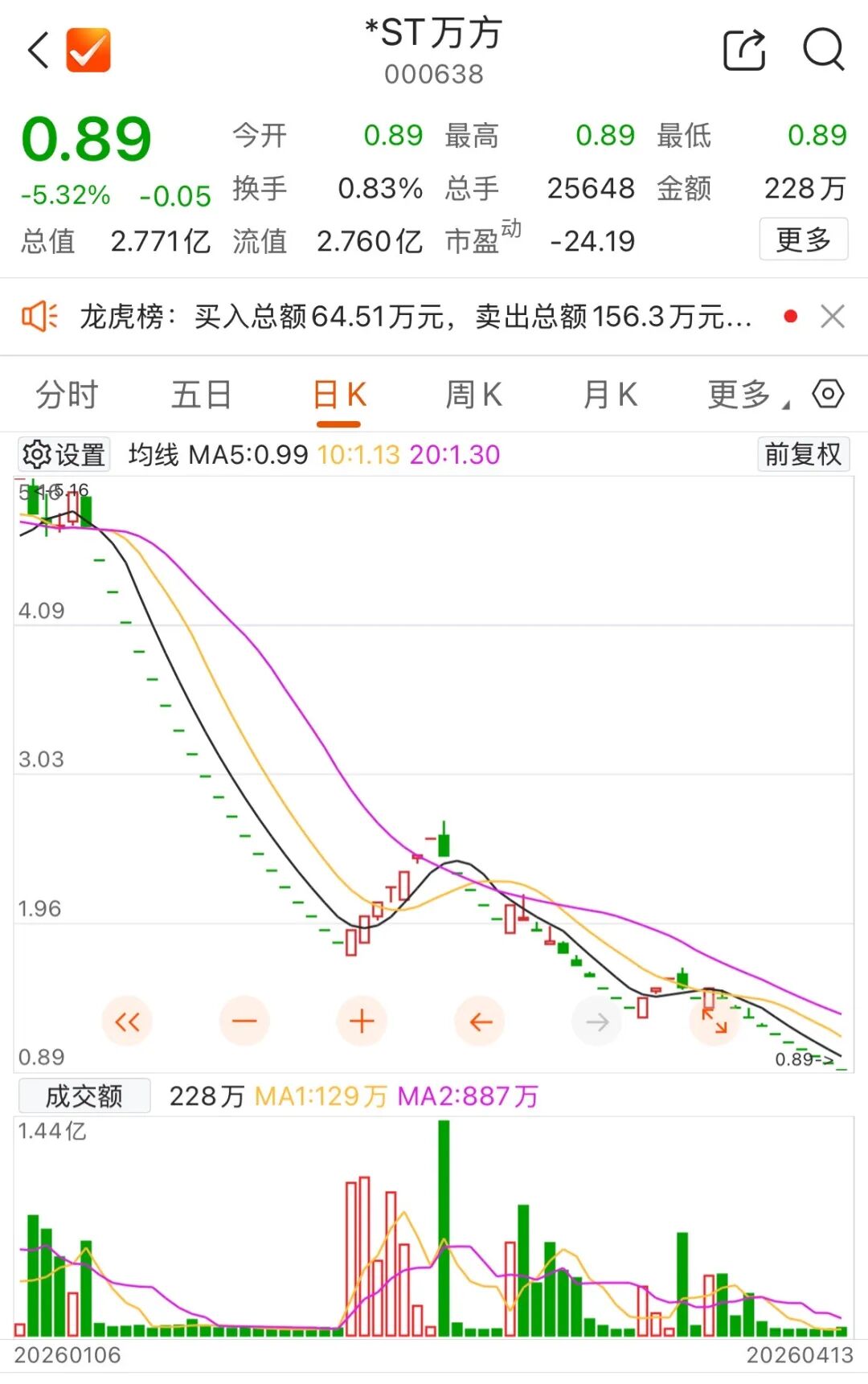 4月13日,公司股价收盘报0.89元/股,总市值2.77亿元,年内跌幅超80%。