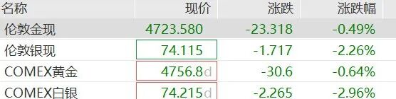 贵金属集体下跌,现货白银跌超2%,现货黄金跌0.5%。COMEX黄金期货跌0.6%,COMEX白银期货跌3%。