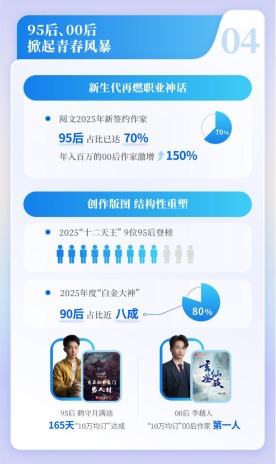值得关注的是,“95后”“00后”正在从读写两端推动行业革新。从创作端看,2025年阅文新签约作家中,“95后”已达70%,稿酬收入超百万的“00后”作家数量同比增长150%。从读者端看,2025年起点读书新增用户中,“00后”占比达38%,成为最大群体。