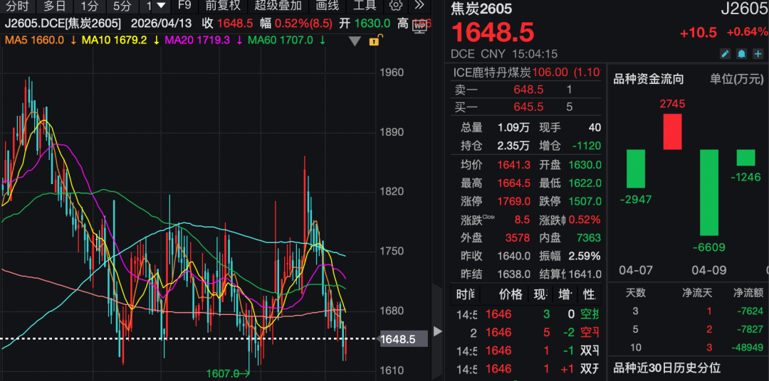 4月13日,国内期货市场焦炭主力合约2605小幅上行,截至下午收盘报1648.5元/吨,较3月下旬1863元/吨的高位已回落超11%,基本回吐前期涨幅,逼近年内低点。