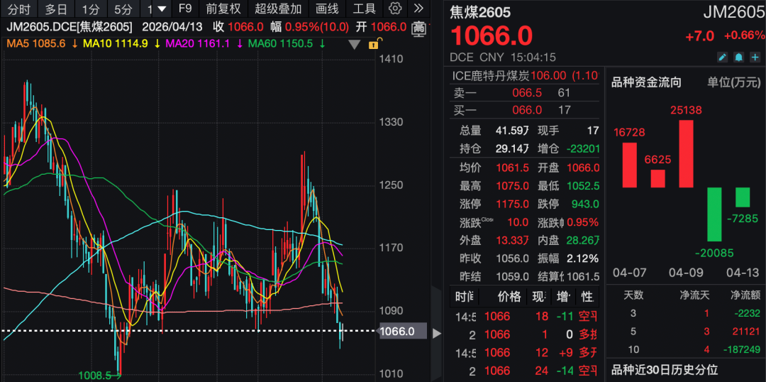 上游焦煤价格同步走出了弱势行情。4月13日,焦煤主力合约2605最低下探至1052.5元/吨,较3月下旬逼近1300元/吨的价格高点回落近20%。