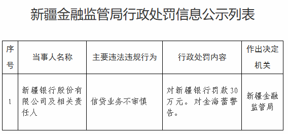 【大河财立方消息】4月13日,新疆金融监管局行政处罚信息公示列表显示,新疆银行因信贷业务不审慎被新疆金融监管局罚款30万元;相关责任人金海蕾被警告。