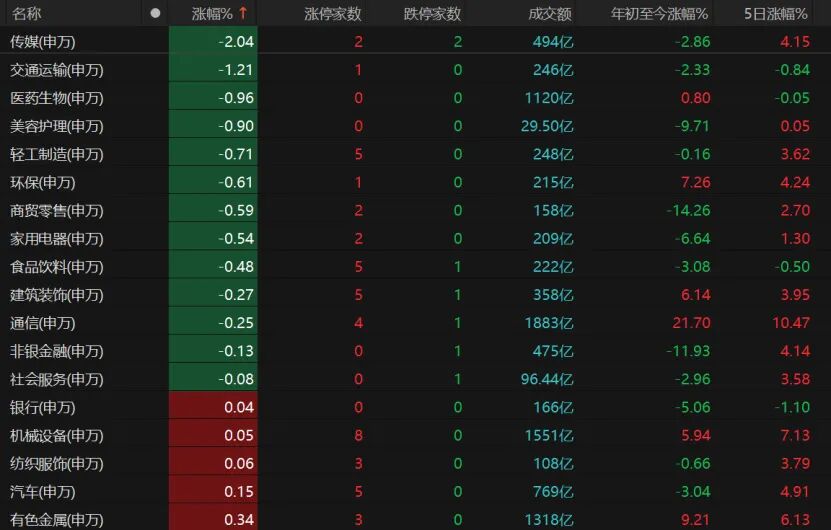13个申万一级行业收跌,传媒跌逾2%,交通运输、医药生物、美容护理、轻工制造领跌。
