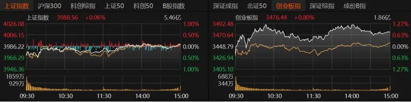 今日A股低开高走,主要指数翻红。沪指收涨0.06%报3988.56点,创业板指收涨0.8%报3476.44点,深证成指收涨0.69%。沪深300、科创50、北证50均微红,上证50平盘。