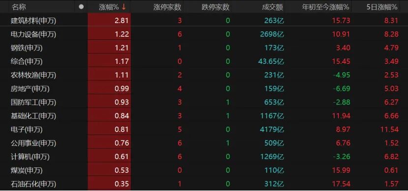 板块方面,建筑材料大涨2.81%,中材科技、中国巨石、宏和科技等个股涨停;电力设备、钢铁、农林牧渔、国防军工等板块也表现较好,其中天邦食品、华英农业涨停,兴图新科“20cm”涨停。
