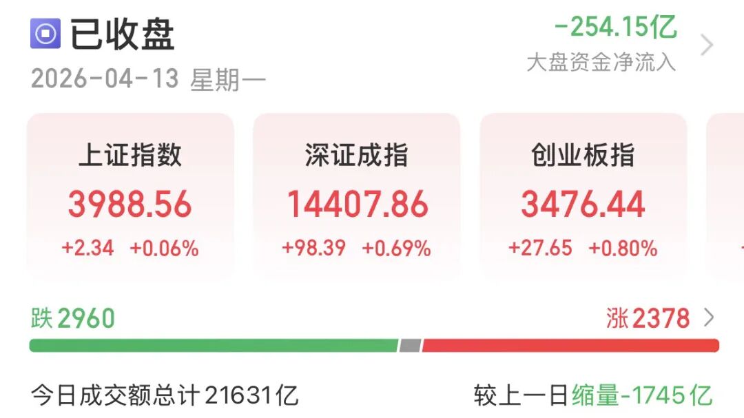 4月13日,A股低开高走,显示出较强韧性。市场量能微缩,板块分化明显,体现出存量资金博弈的特征,但成交额仍保持在2.1万亿元上方。板块方面,电力设备、军工、电子表现较好,而传媒、医药、大消费则领跌。