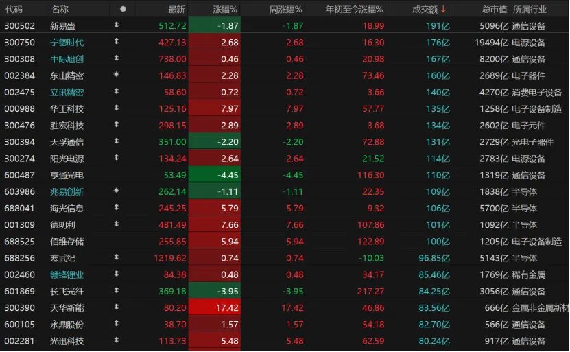 个股方面,共计2378只收涨,涨停股86只;2960只个股收跌,跌停股10只。14只个股日成交额不低于100亿元,新易盛跌近2%,天孚通信跌逾2%,宁德时代、阳光电源、东山精密、胜宏科技均表现不错,华工科技涨近8%。