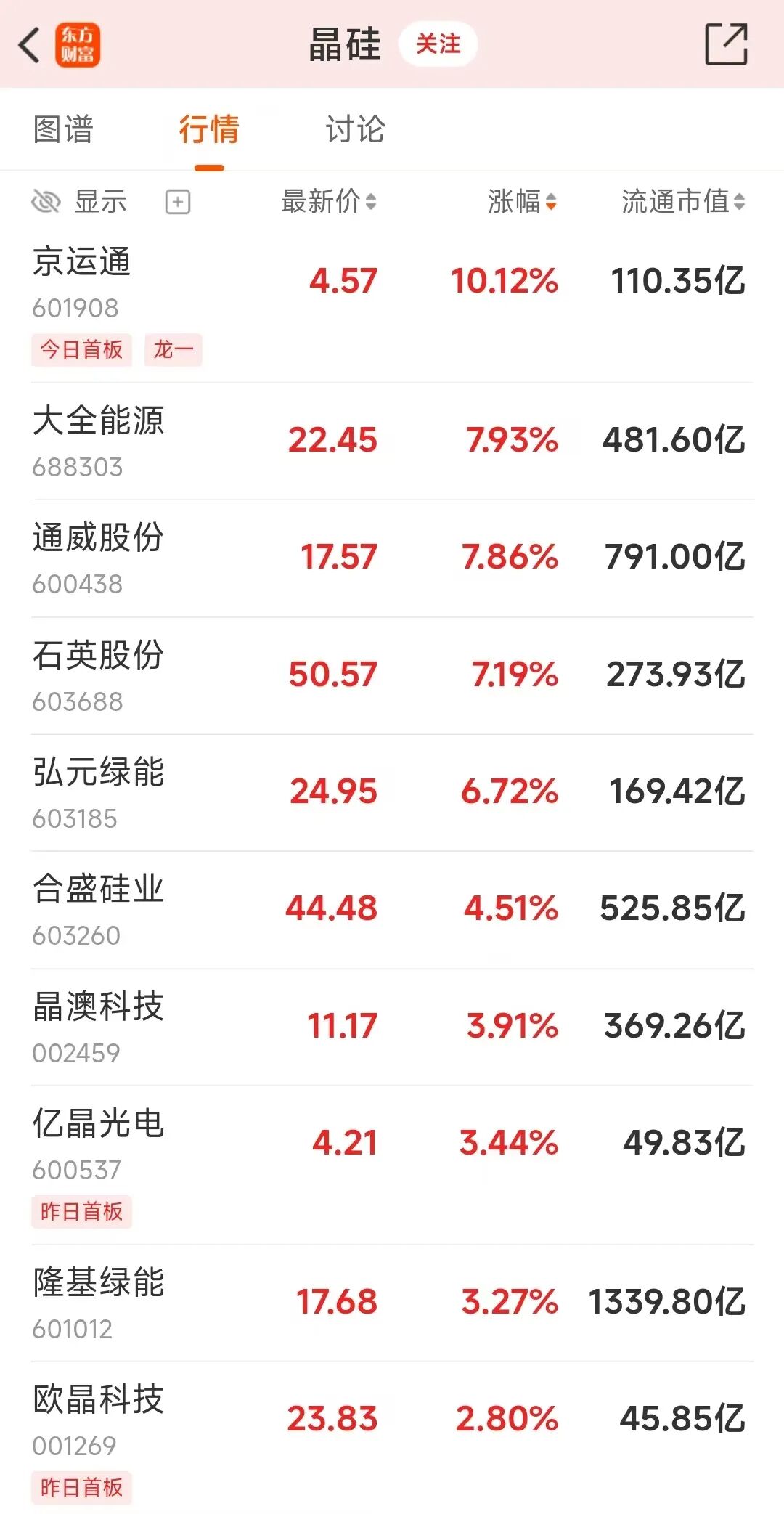 受此影响,硅料方向4月13日集体走强,京运通涨停;大全能源、通威股份、石英股份、弘元绿能、合盛硅业等上涨明显。