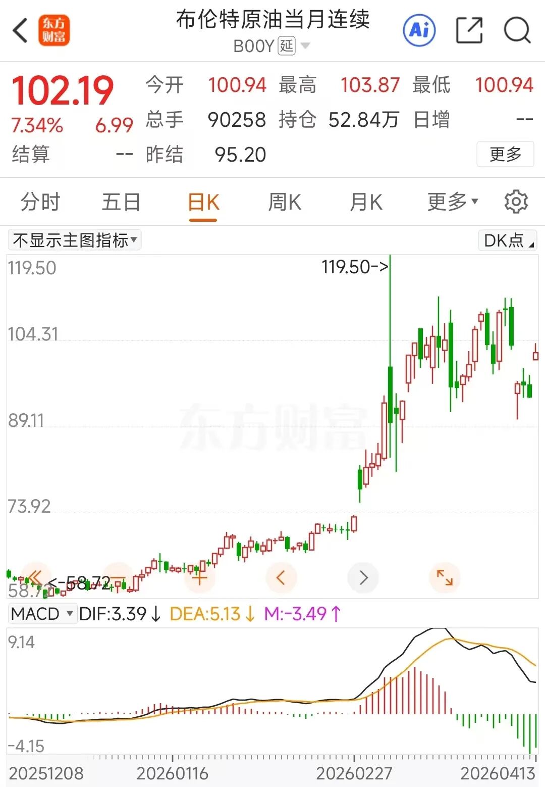 受协议未达成、美国威胁封锁霍尔木兹海峡等影响,布伦特原油4月13日跳空大涨,至截稿时涨幅超过7%,重新回到100美元/桶上方。WTI原油同样跳空大涨,至截稿时涨幅也超过7%。