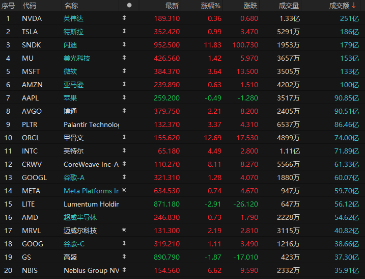 第3名闪迪收高11.83%,成交176.06亿美元。该股再创历史新高,使其今年迄今涨幅超过300%。