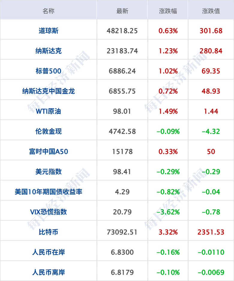 美股三大指数集体收涨,道指涨0.63%,纳指涨1.23%,标普500指数涨1.02%,热门科技股普涨,甲骨文涨超12%,英特尔涨超4%,微软涨超3%,博通涨超2%;锂矿概念、加密矿企、计算机硬件涨幅居前,Circle涨超12%,闪迪涨超11%,戴尔科技、美国雅保涨超6%,惠普、HUT8涨超5%,Coinbase涨近4%,罗技涨超3%。中概股多数上涨,纳斯达克中国金龙指数涨0.72%,金山云涨超6%,晶科能源涨近4%,百度集团、老虎证券涨逾3%,哔哩哔哩涨近3%,理想汽车跌超2%。