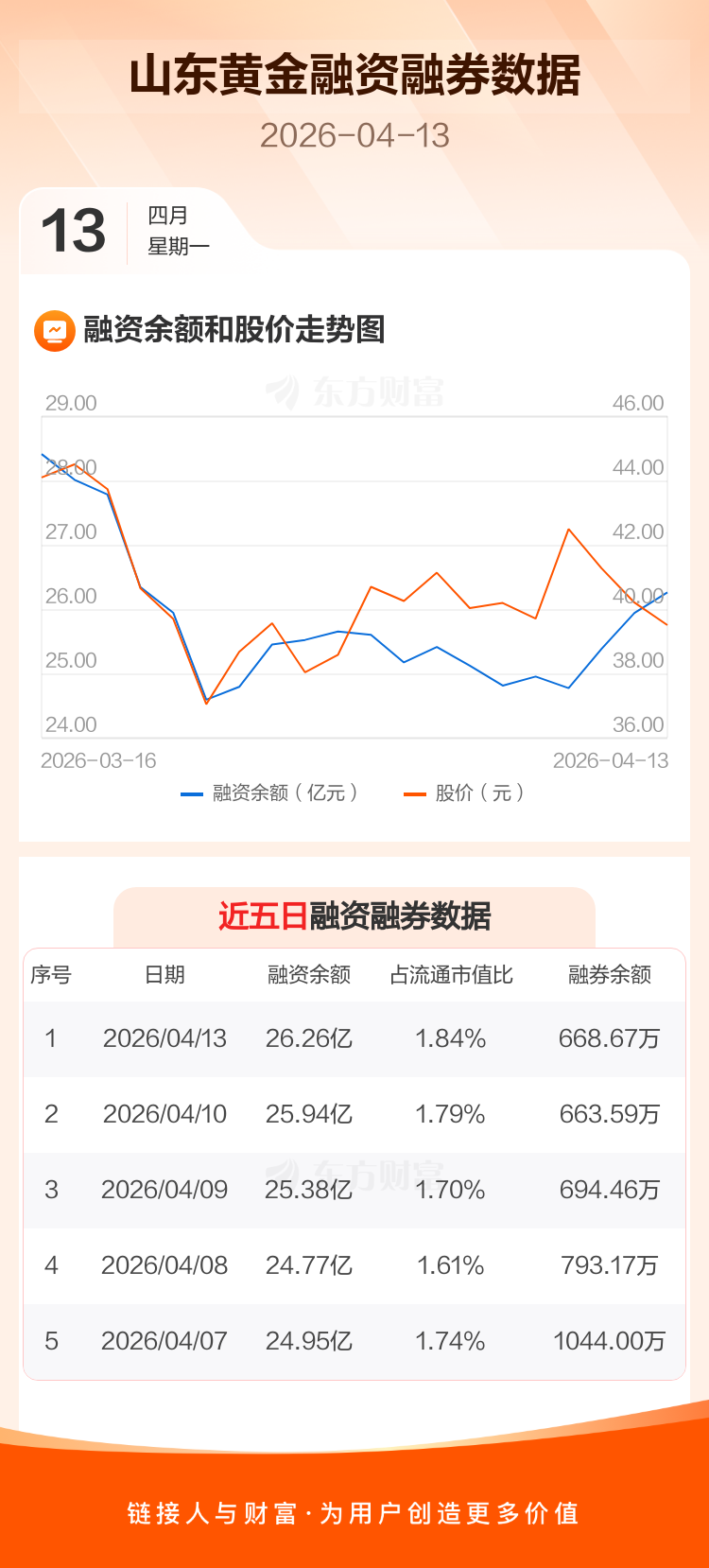 交易所最新数据显示,山东黄金于2026年4月13日获融资买入1.30亿元,融资偿还9746.32万元,当日融资净买入3205.18万元。目前,该股融资余额26.26亿,占流通市值比例为1.84%。