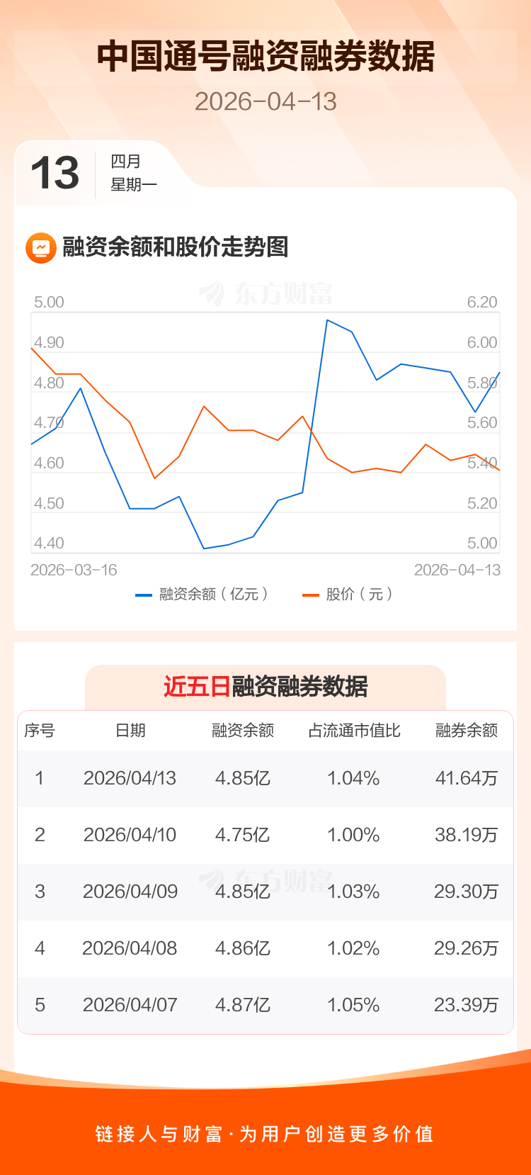 交易所最新数据显示,中国通号于2026年4月13日获融资买入2000.89万元,融资偿还966.29万元,当日融资净买入1034.6万元。目前,该股融资余额4.85亿,占流通市值比例为1.04%。
