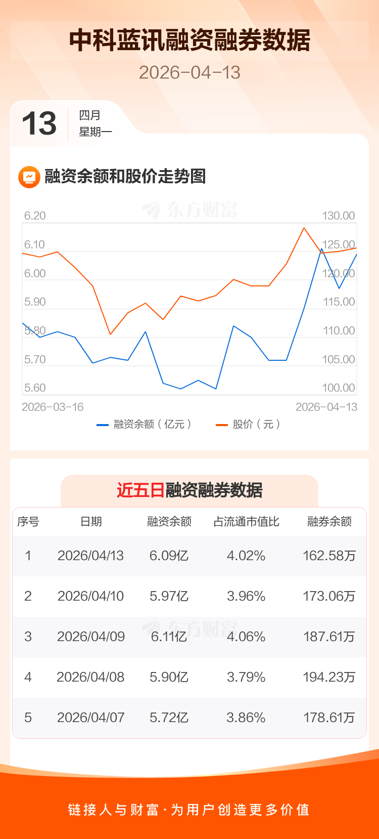 交易所最新数据显示,中科蓝讯于2026年4月13日获融资买入3738.64万元,融资偿还2467.62万元,当日融资净买入1271.02万元。目前,该股融资余额6.09亿,占流通市值比例为4.02%。