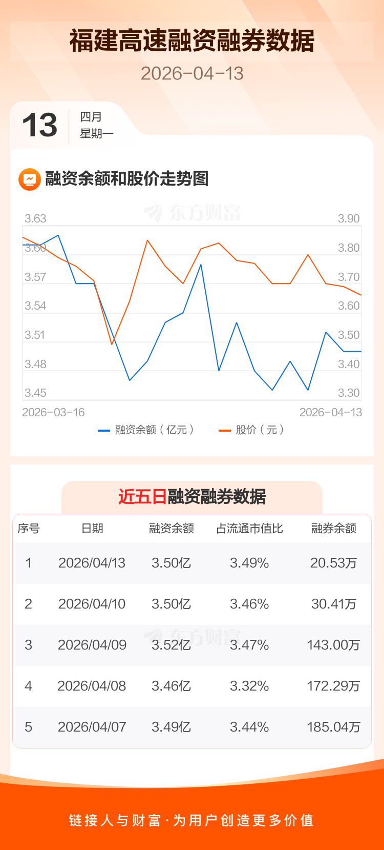 交易所最新数据显示,福建高速于2026年4月13日获融资买入1022.71万元,融资偿还1020.31万元,当日融资净买入2.4万元。目前,该股融资余额3.50亿,占流通市值比例为3.49%。