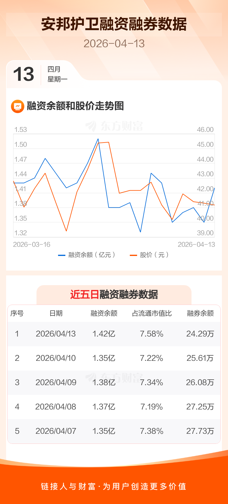 交易所最新数据显示,安邦护卫于2026年4月13日获融资买入1003.64万元,融资偿还369.32万元,当日融资净买入634.32万元。目前,该股融资余额1.42亿,占流通市值比例为7.58%。