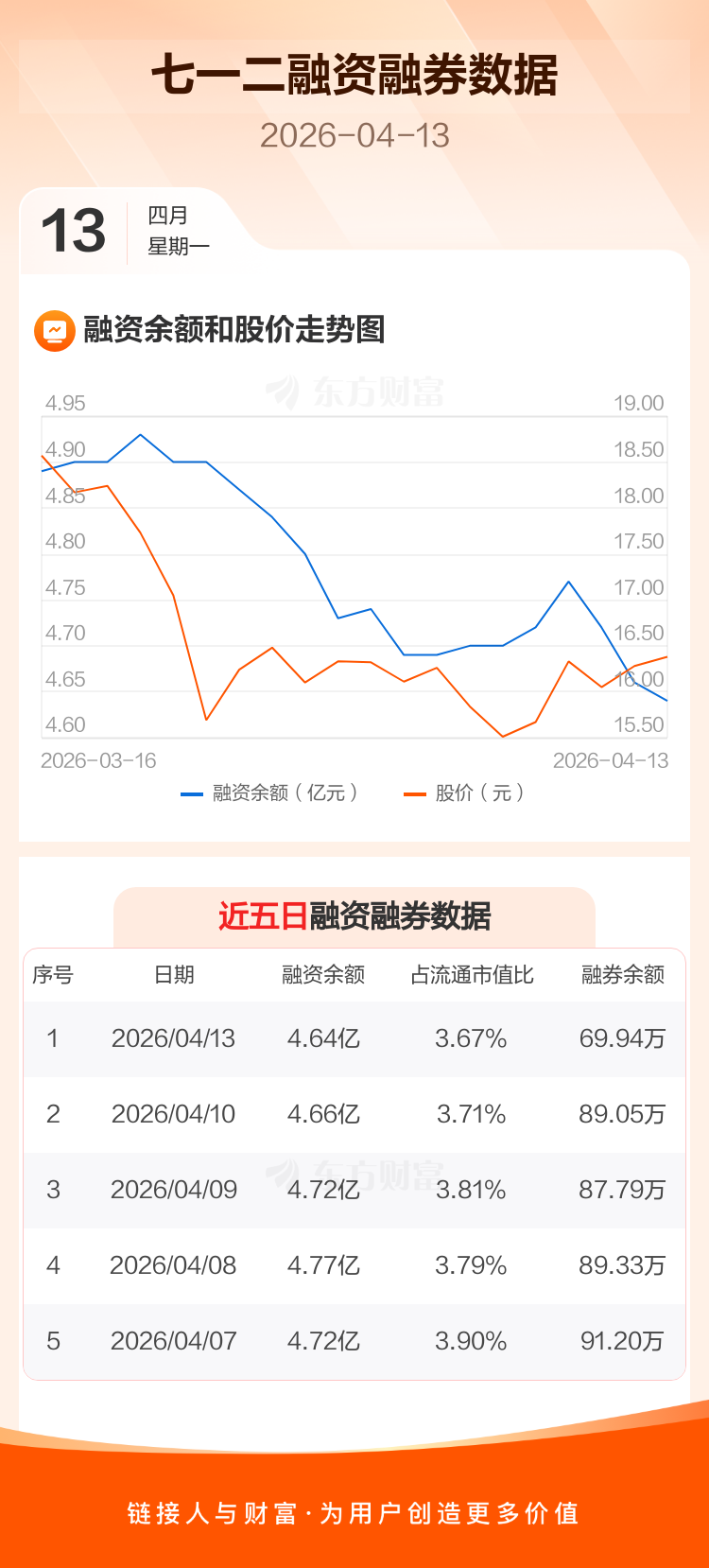 交易所最新数据显示,七一二于2026年4月13日获融资买入475.75万元,融资偿还689.78万元,当日融资净偿还214.03万元。目前,该股融资余额4.64亿,占流通市值比例为3.67%。