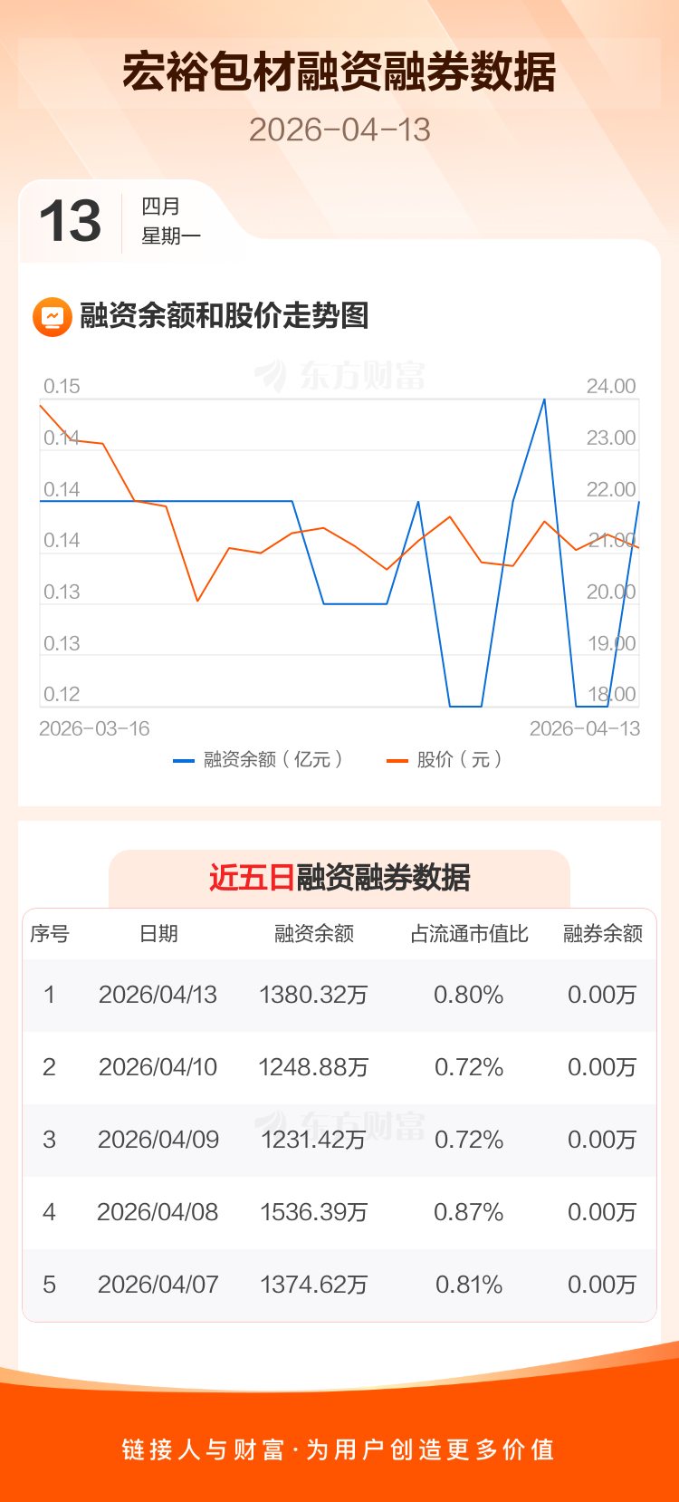 交易所最新数据显示,宏裕包材于2026年4月13日获融资买入230.94万元,融资偿还99.49万元,当日融资净买入131.44万元。目前,该股融资余额1380.32万,占流通市值比例为0.80%。