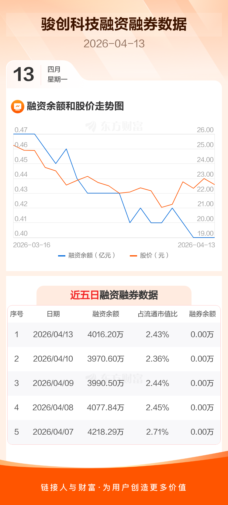 交易所最新数据显示,骏创科技于2026年4月13日获融资买入150.45万元,融资偿还104.85万元,当日融资净买入45.6万元。目前,该股融资余额4016.20万,占流通市值比例为2.43%。
