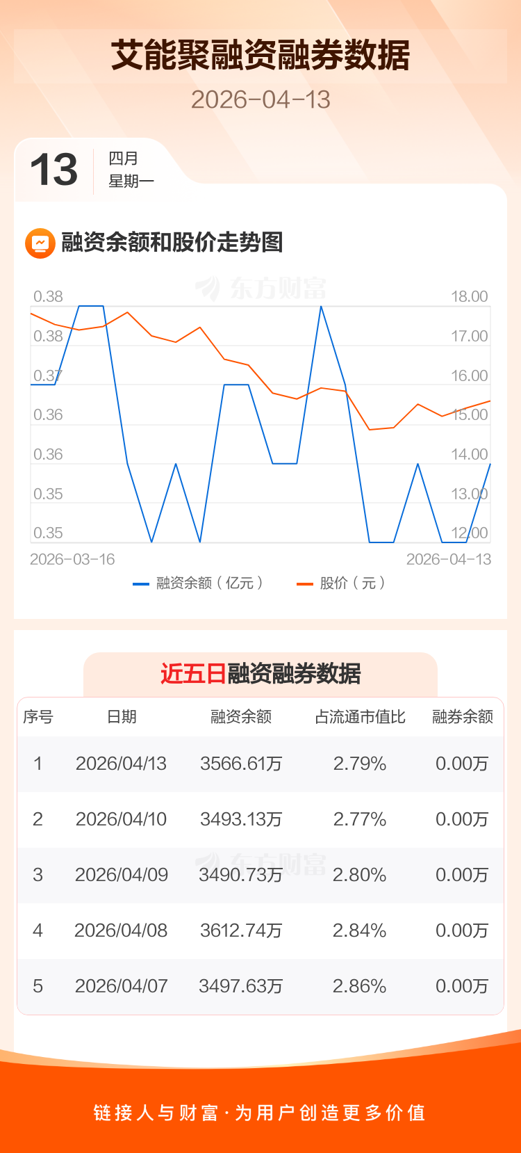 交易所最新数据显示,艾能聚于2026年4月13日获融资买入226.02万元,融资偿还152.53万元,当日融资净买入73.49万元。目前,该股融资余额3566.61万,占流通市值比例为2.79%。