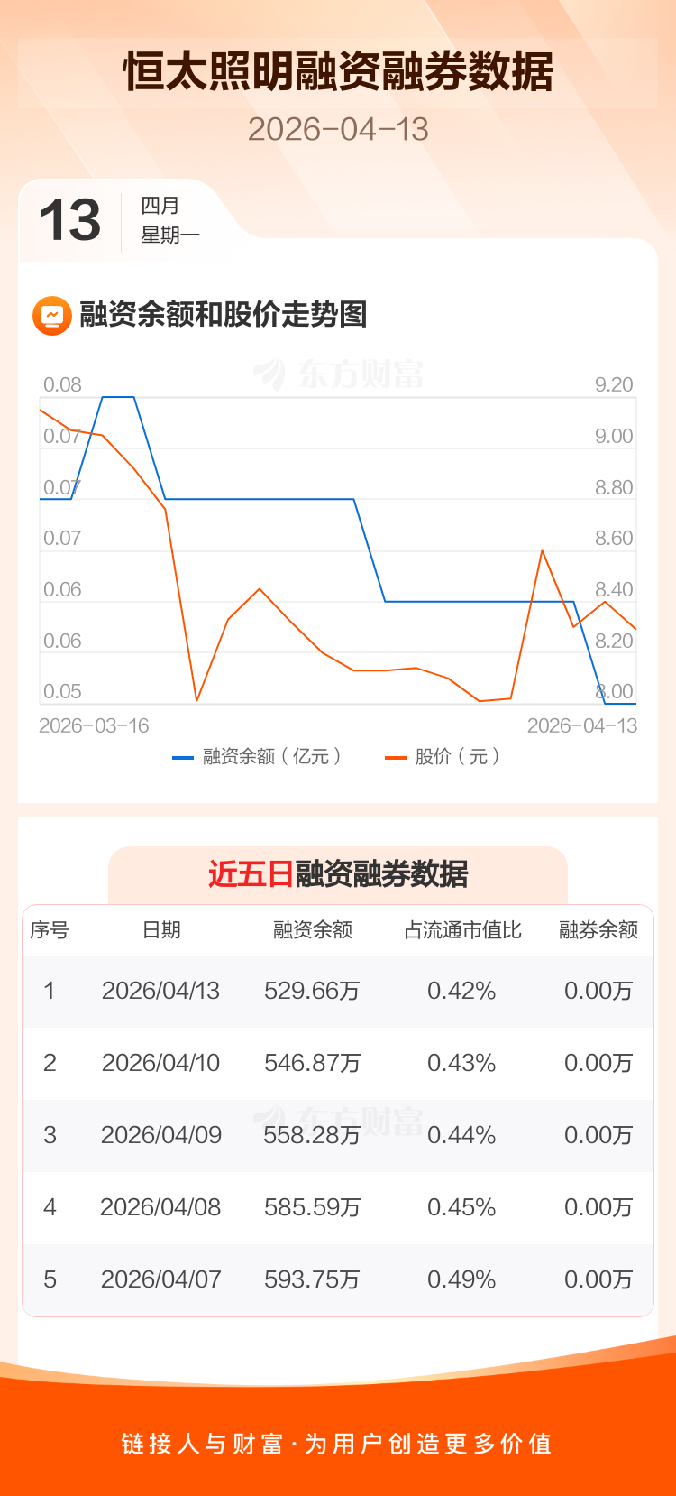 交易所最新数据显示,恒太照明于2026年4月13日获融资买入28.18万元,融资偿还45.39万元,当日融资净偿还17.21万元。目前,该股融资余额529.66万,占流通市值比例为0.42%。