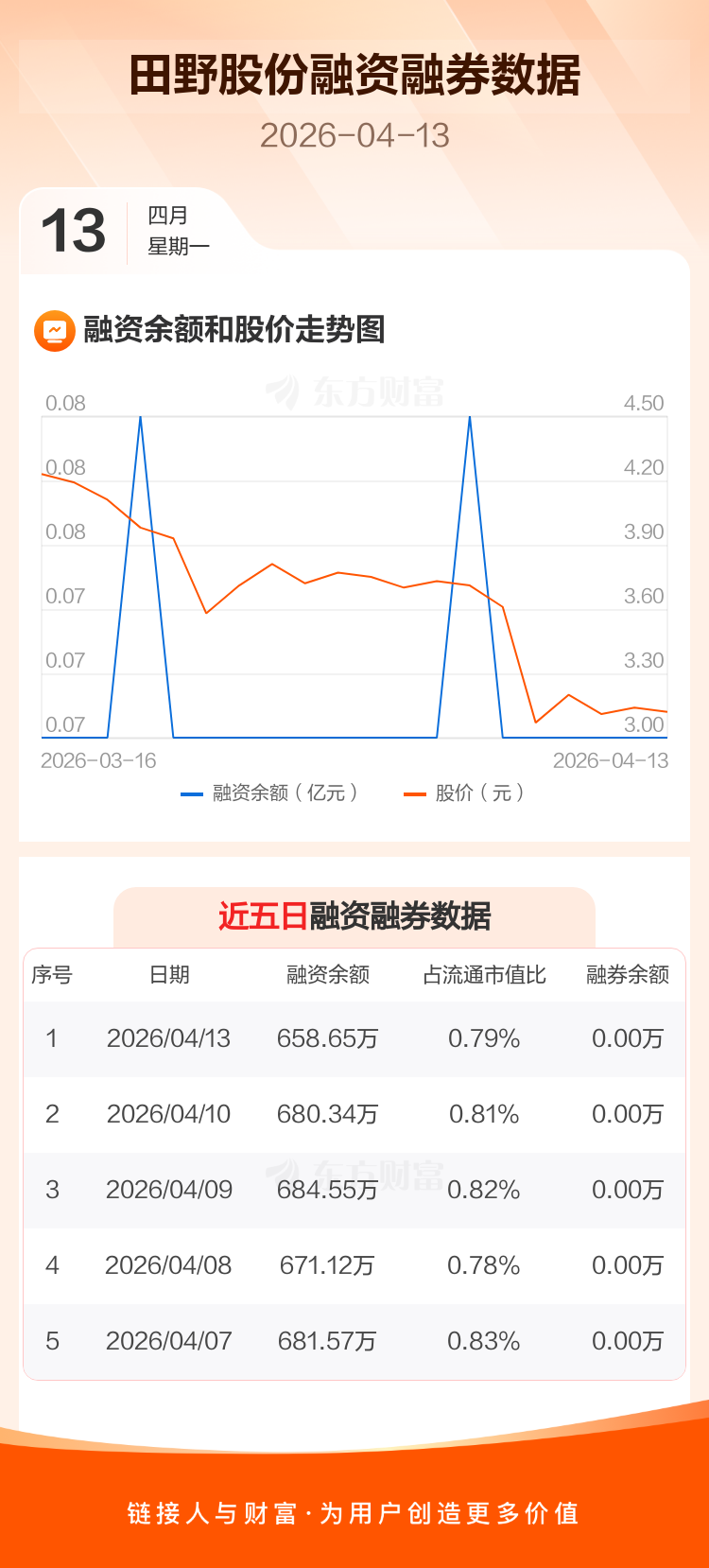 交易所最新数据显示,田野股份于2026年4月13日获融资买入4622元,融资偿还22.15万元,当日融资净偿还21.69万元。目前,该股融资余额658.65万,占流通市值比例为0.79%。