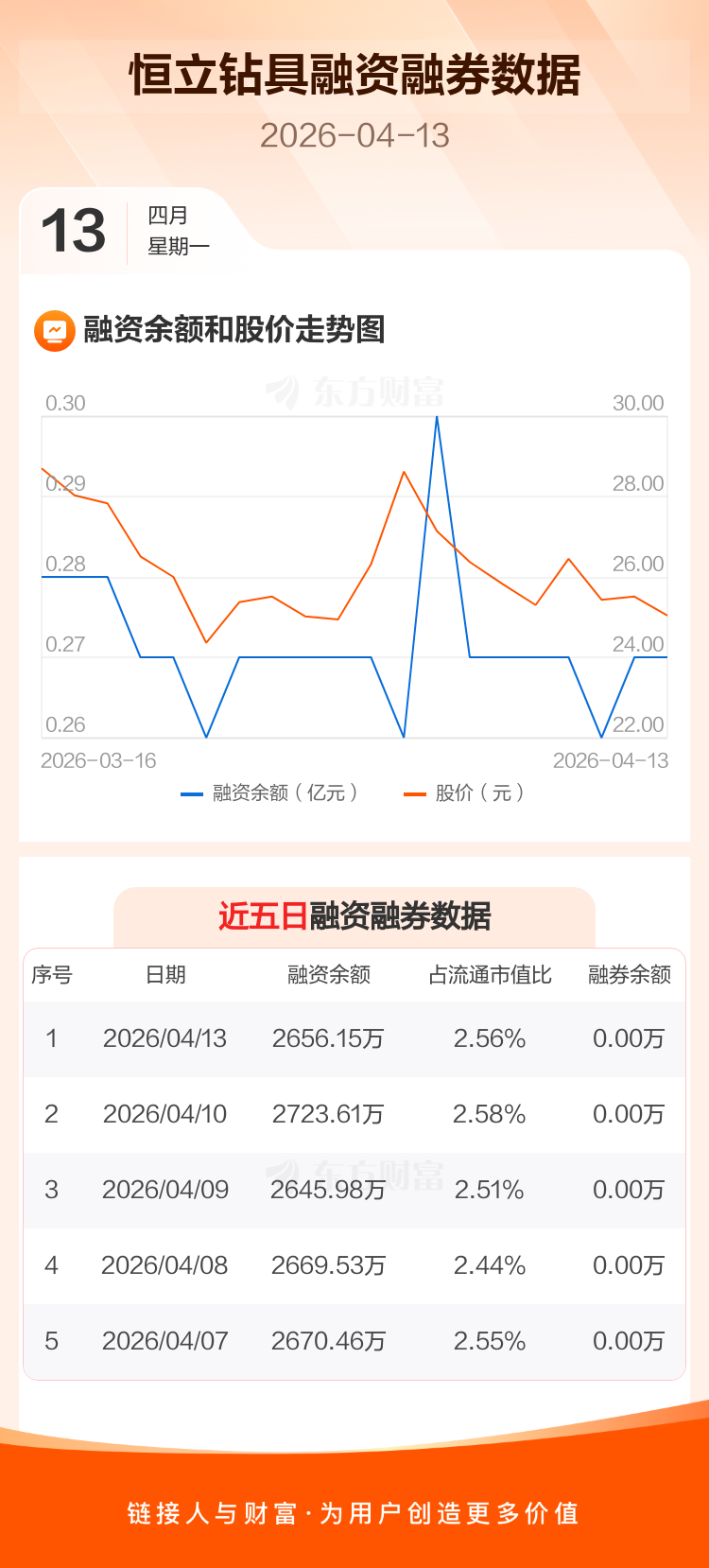 交易所最新数据显示,恒立钻具于2026年4月13日获融资买入64.11万元,融资偿还131.57万元,当日融资净偿还67.46万元。目前,该股融资余额2656.15万,占流通市值比例为2.56%。