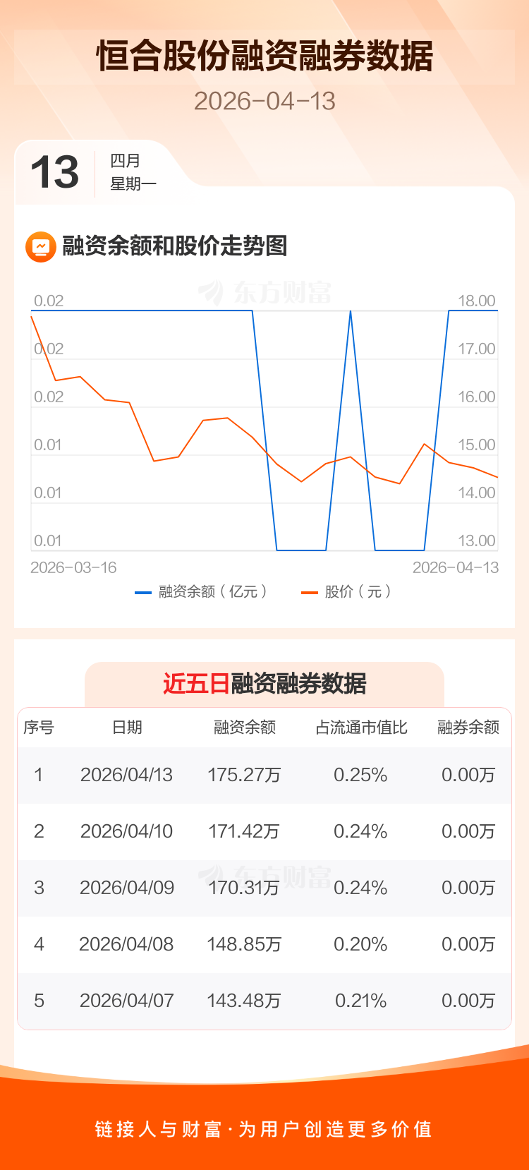 交易所最新数据显示,恒合股份于2026年4月13日获融资买入5.37万元,融资偿还1.52万元,当日融资净买入3.85万元。目前,该股融资余额175.27万,占流通市值比例为0.25%。