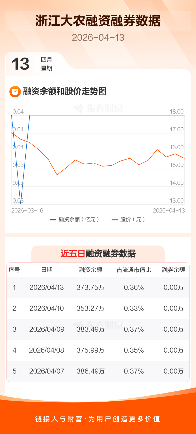 交易所最新数据显示,浙江大农于2026年4月13日获融资买入44.77万元,融资偿还24.29万元,当日融资净买入20.48万元。目前,该股融资余额373.75万,占流通市值比例为0.36%。