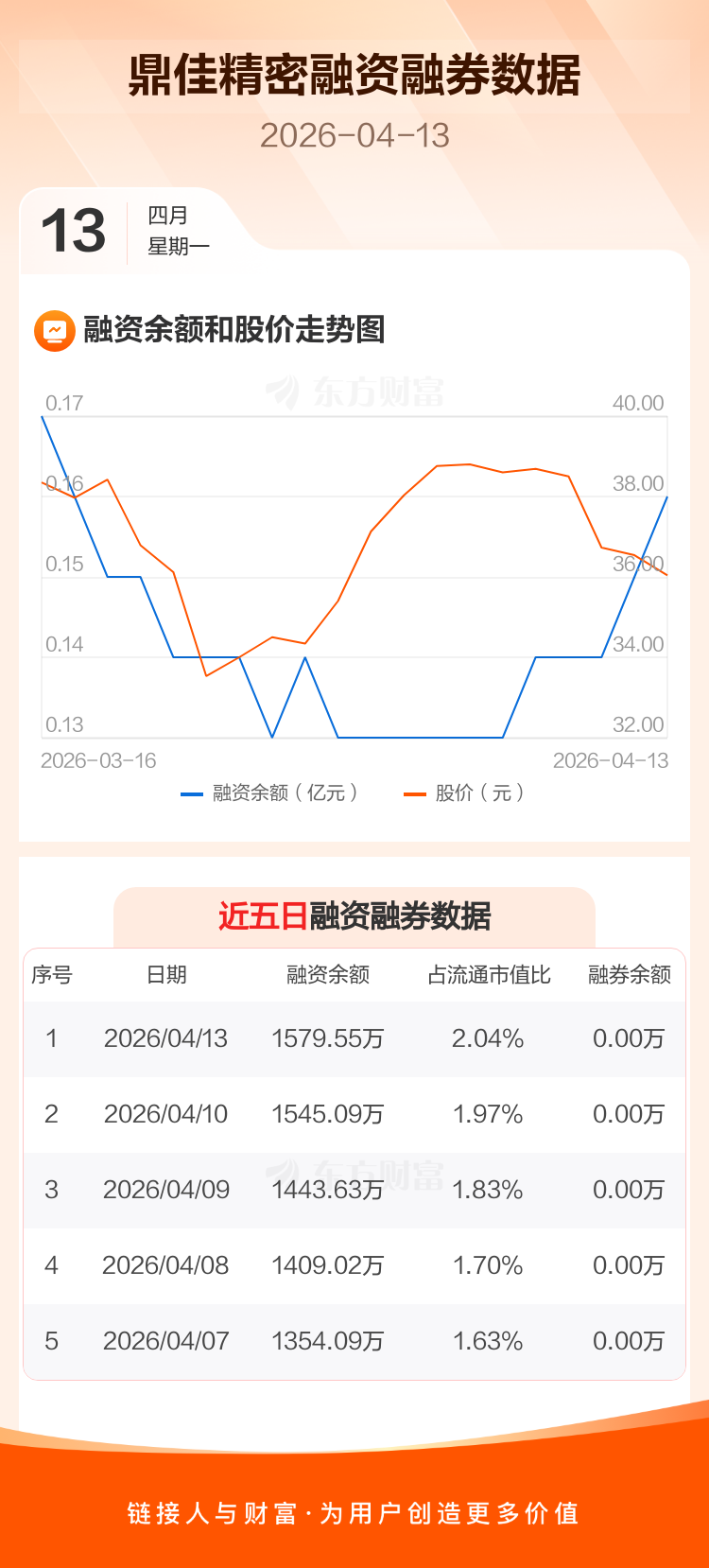 交易所最新数据显示,鼎佳精密于2026年4月13日获融资买入38.16万元,融资偿还3.71万元,当日融资净买入34.45万元。目前,该股融资余额1579.55万,占流通市值比例为2.04%。