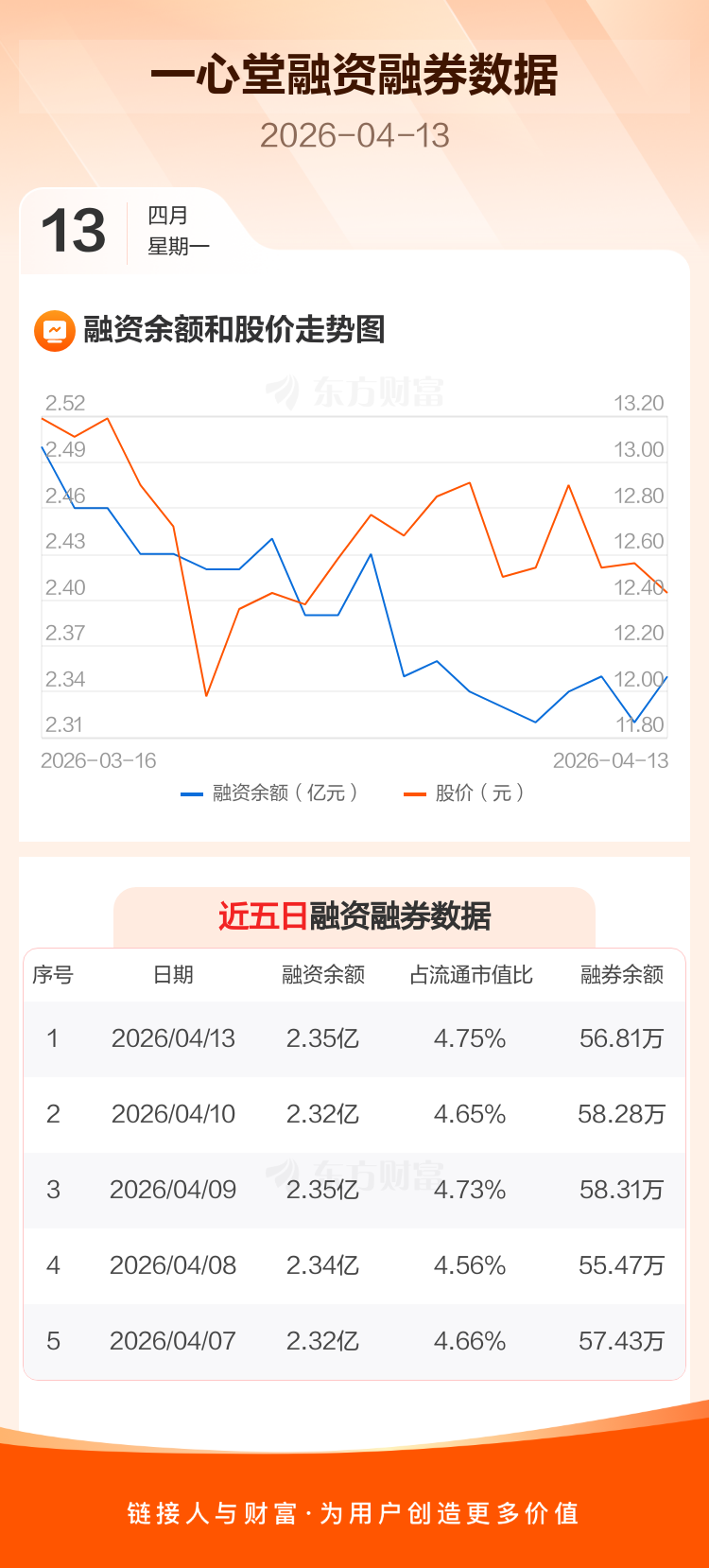 交易所最新数据显示,一心堂于2026年4月13日获融资买入662.92万元,融资偿还431.69万元,当日融资净买入231.23万元。目前,该股融资余额2.35亿,占流通市值比例为4.75%。
