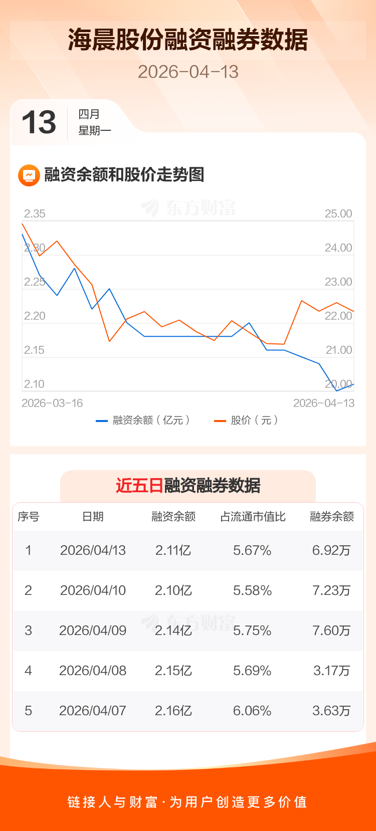 交易所最新数据显示,海晨股份于2026年4月13日获融资买入763.33万元,融资偿还669.38万元,当日融资净买入93.96万元。目前,该股融资余额2.11亿,占流通市值比例为5.67%。