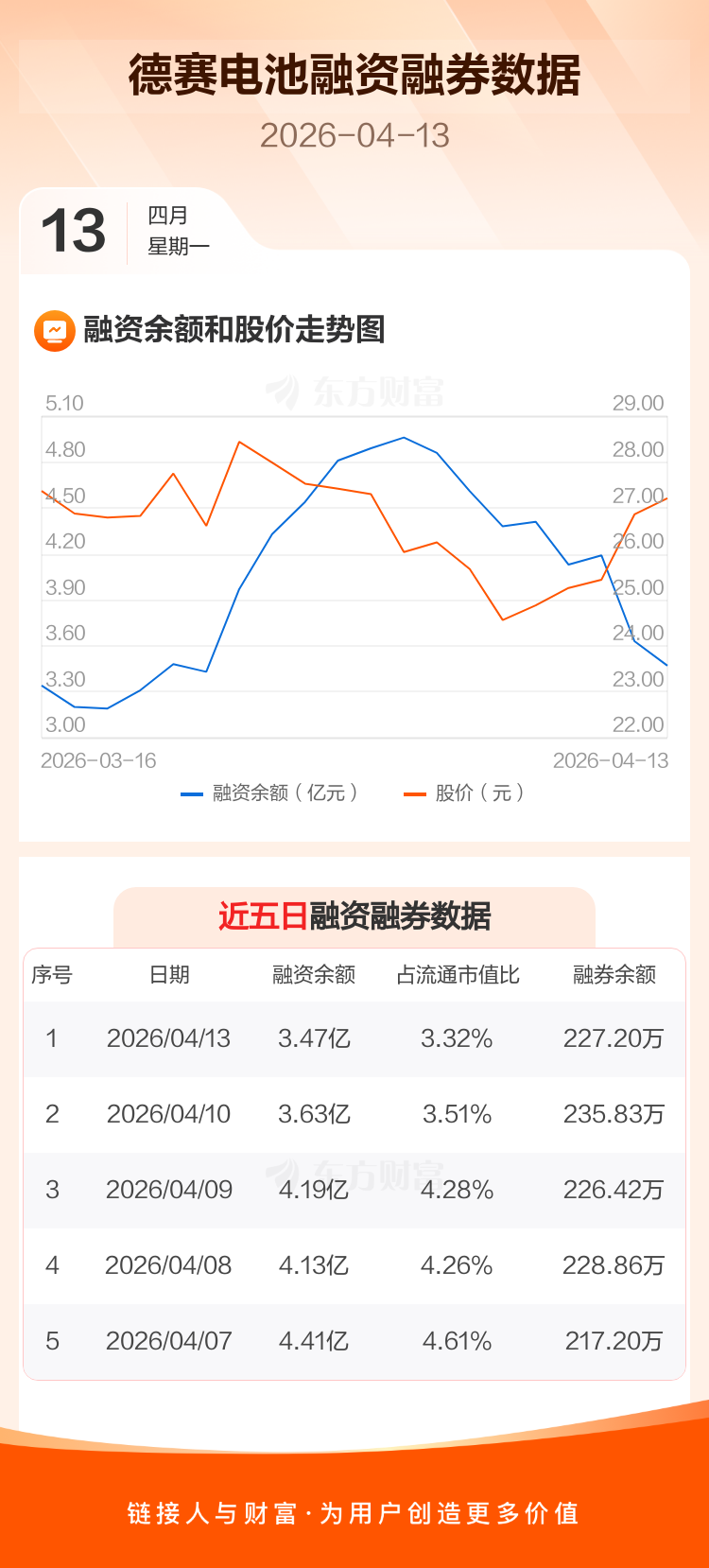 交易所最新数据显示,德赛电池于2026年4月13日获融资买入4501.10万元,融资偿还6064.28万元,当日融资净偿还1563.18万元。目前,该股融资余额3.47亿,占流通市值比例为3.32%。