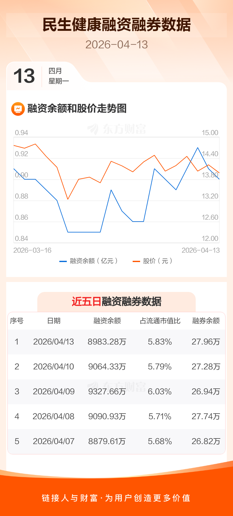 交易所最新数据显示,民生健康于2026年4月13日获融资买入355.41万元,融资偿还436.45万元,当日融资净偿还81.05万元。目前,该股融资余额8983.28万,占流通市值比例为5.83%。