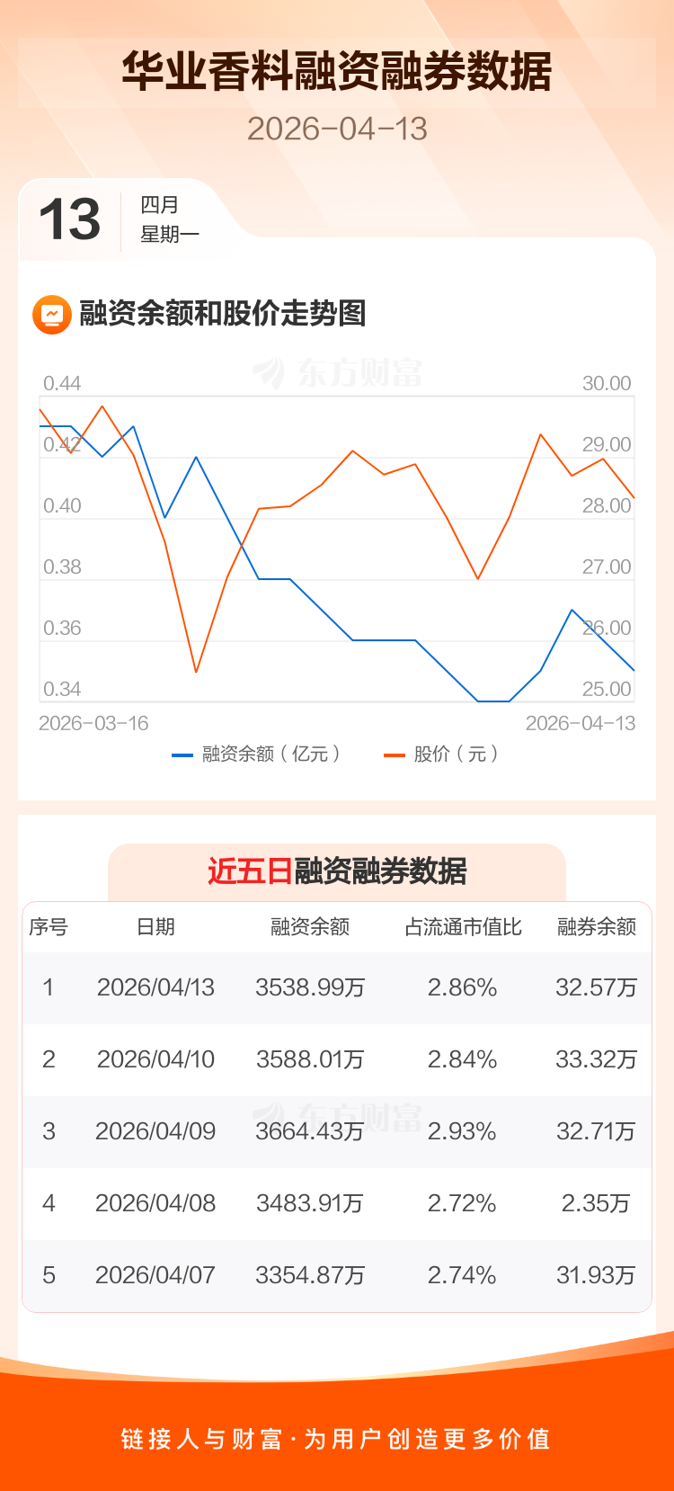 交易所最新数据显示,华业香料于2026年4月13日获融资买入304.32万元,融资偿还353.34万元,当日融资净偿还49.02万元。目前,该股融资余额3538.99万,占流通市值比例为2.86%。