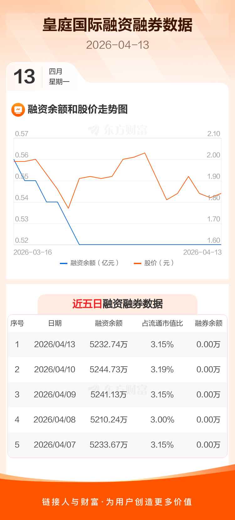交易所最新数据显示,皇庭国际于2026年4月13日获融资买入66.15万元,融资偿还78.13万元,当日融资净偿还11.99万元。目前,该股融资余额5232.74万,占流通市值比例为3.15%。