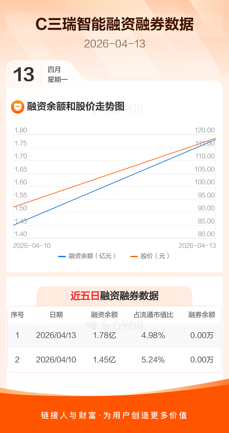交易所最新数据显示,C三瑞智能于2026年4月13日获融资买入1.59亿元,融资偿还1.26亿元,当日融资净买入3252.34万元。目前,该股融资余额1.78亿,占流通市值比例为4.98%。