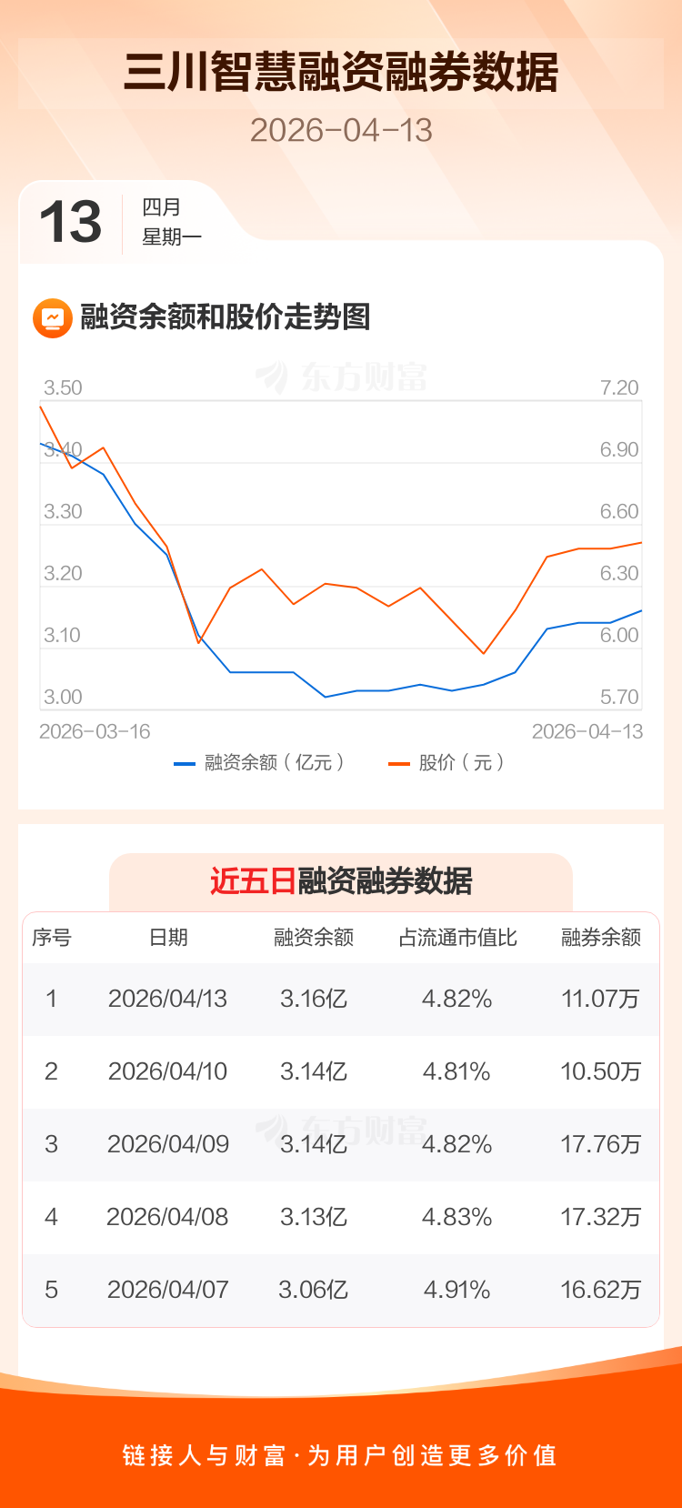 交易所最新数据显示,三川智慧于2026年4月13日获融资买入1507.60万元,融资偿还1305.05万元,当日融资净买入202.56万元。目前,该股融资余额3.16亿,占流通市值比例为4.82%。