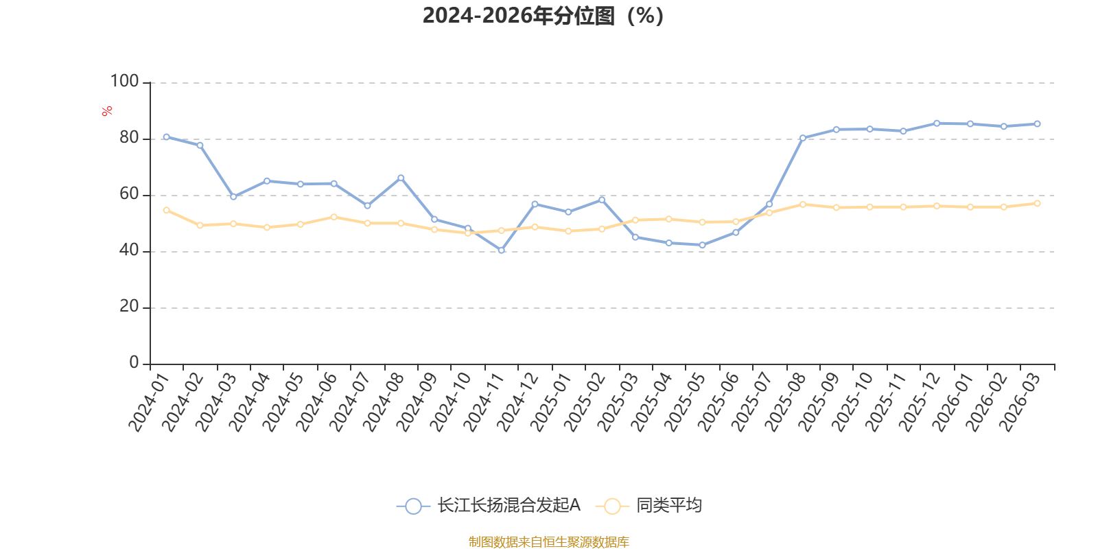 通过所选区间该基金净值增长率分位图,可以观察该基金与同类基金业绩比较情况。图为坐标原点到区间内某时点的净值增长率在同类基金中的分位数。