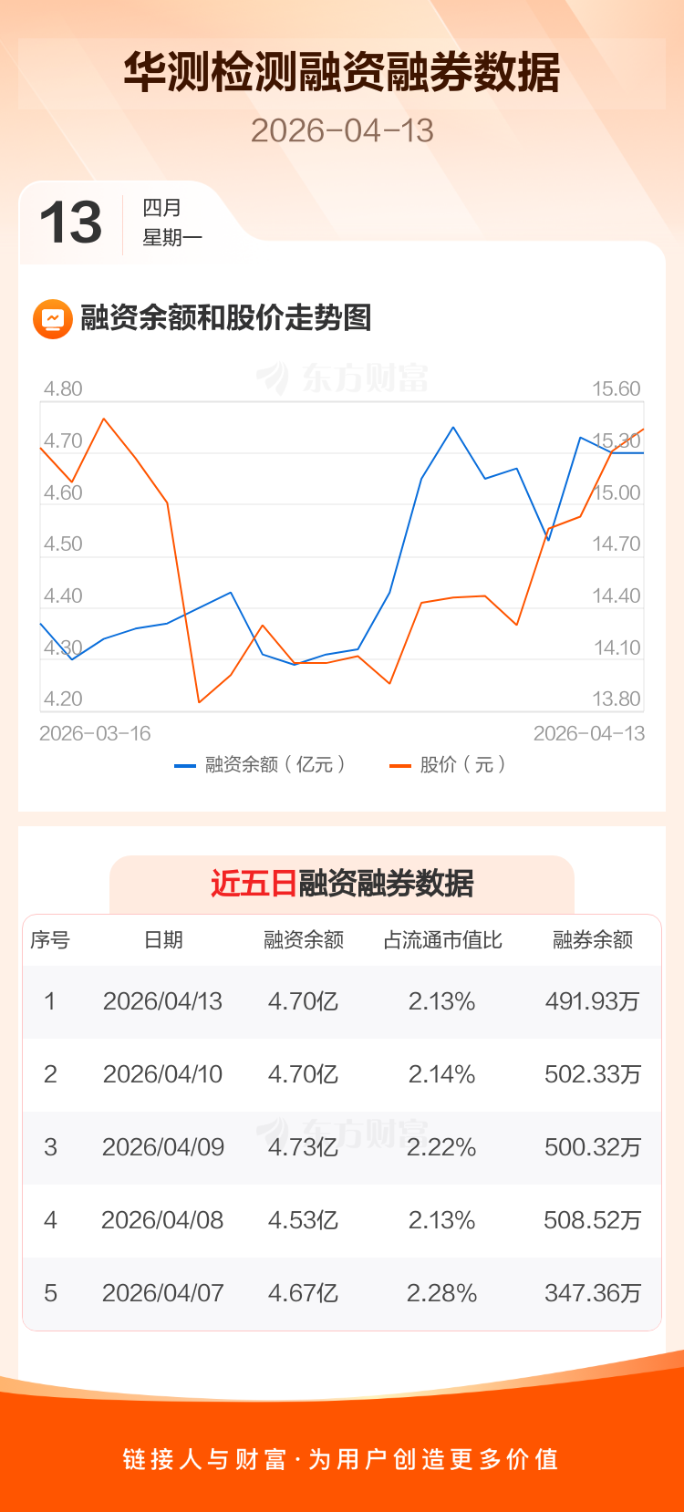 交易所最新数据显示,华测检测于2026年4月13日获融资买入1696.55万元,融资偿还1667.53万元,当日融资净买入29.02万元。目前,该股融资余额4.70亿,占流通市值比例为2.13%。