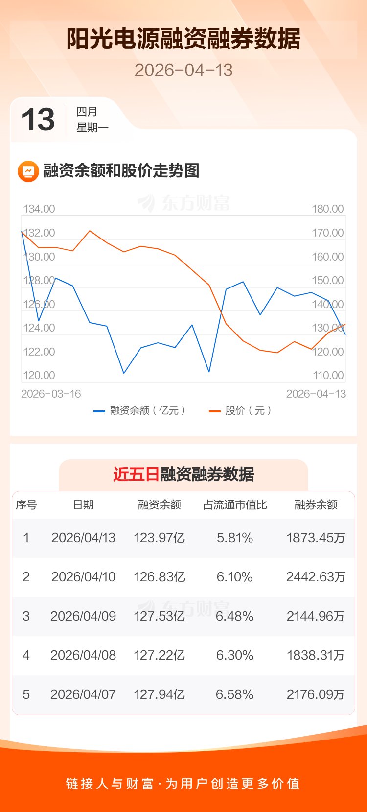 交易所最新数据显示,阳光电源于2026年4月13日获融资买入11.90亿元,融资偿还14.75亿元,当日融资净偿还2.85亿元。目前,该股融资余额123.97亿,占流通市值比例为5.81%。