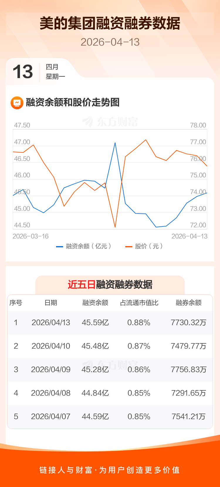 交易所最新数据显示,美的集团于2026年4月13日获融资买入9234.58万元,融资偿还8149.83万元,当日融资净买入1084.75万元。目前,该股融资余额45.59亿,占流通市值比例为0.88%。