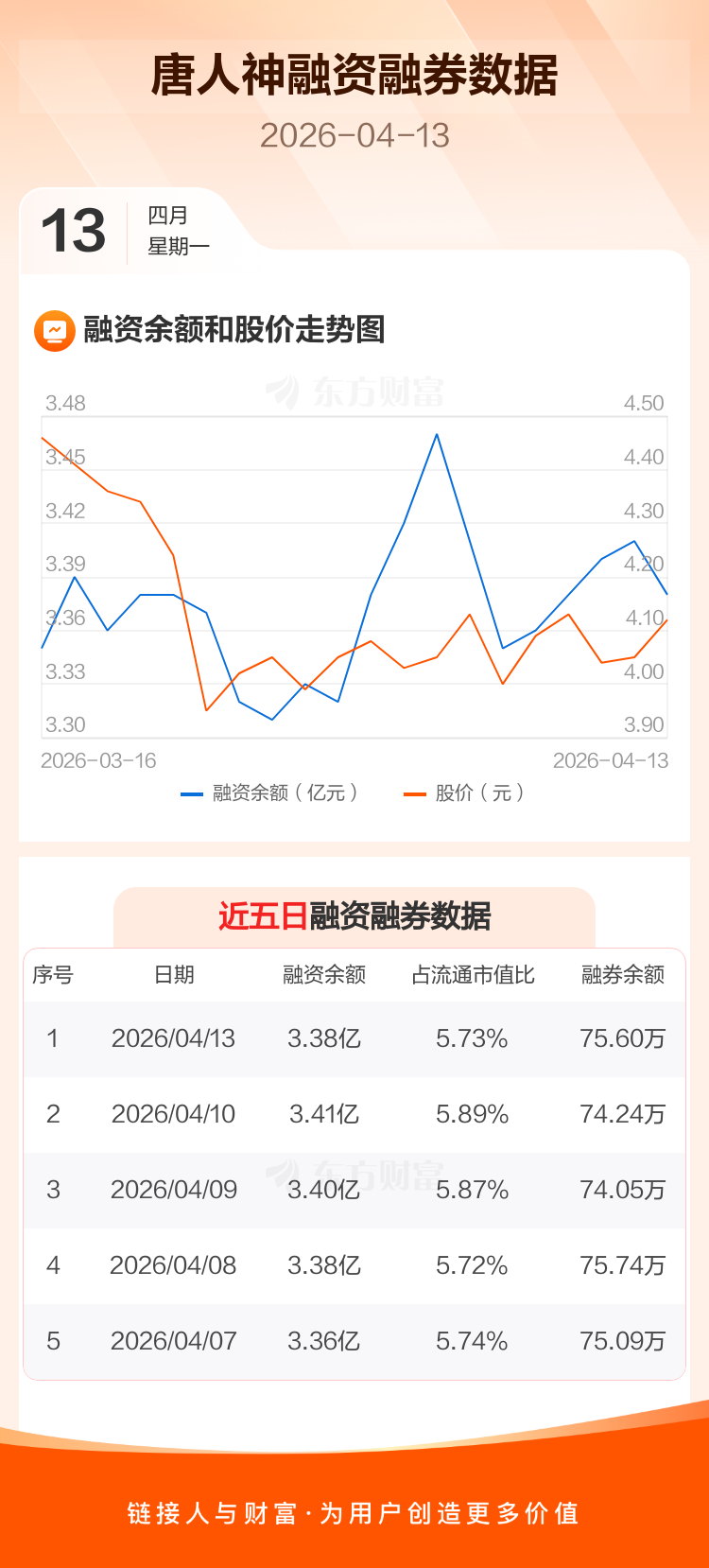 交易所最新数据显示,唐人神于2026年4月13日获融资买入1104.71万元,融资偿还1466.41万元,当日融资净偿还361.7万元。目前,该股融资余额3.38亿,占流通市值比例为5.73%。