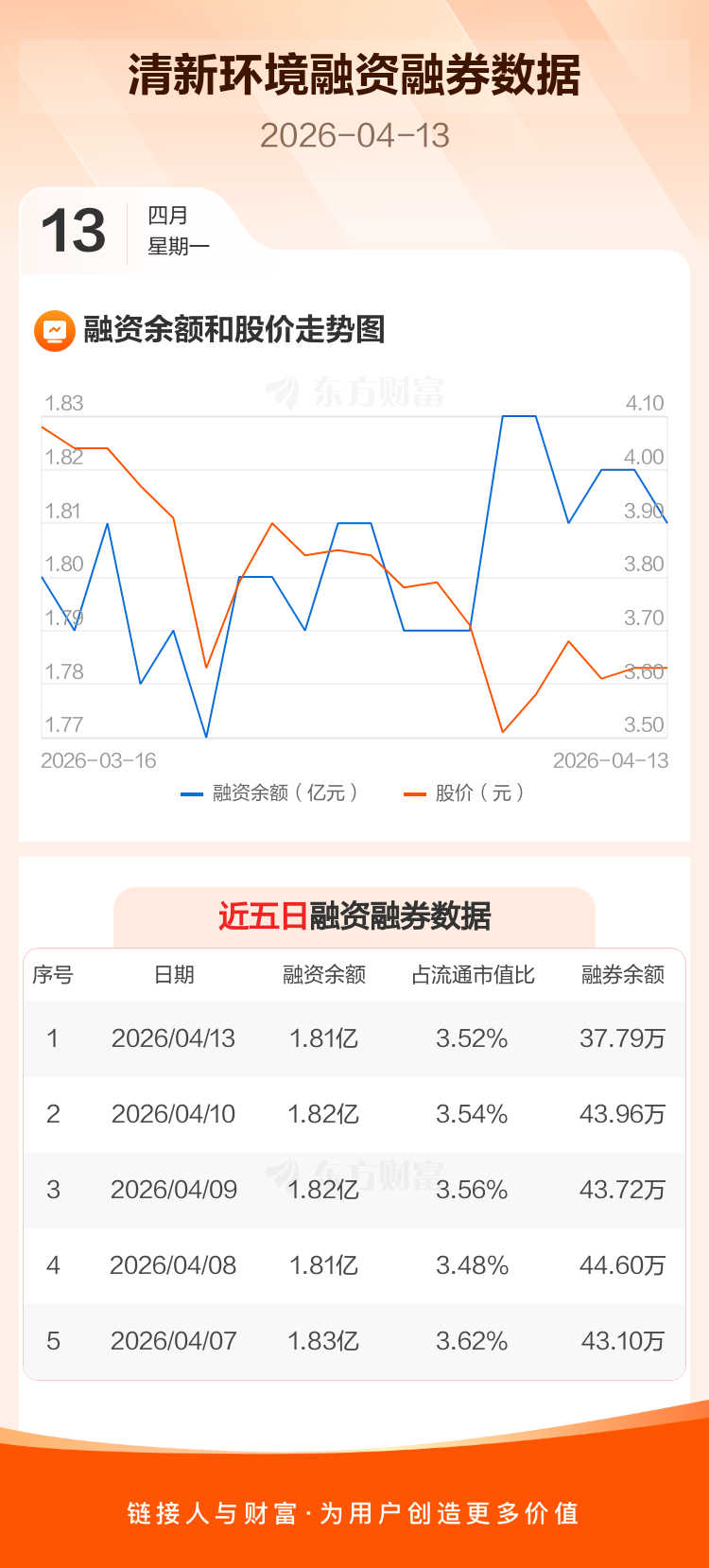 交易所最新数据显示,清新环境于2026年4月13日获融资买入171.07万元,融资偿还258.71万元,当日融资净偿还87.64万元。目前,该股融资余额1.81亿,占流通市值比例为3.52%。