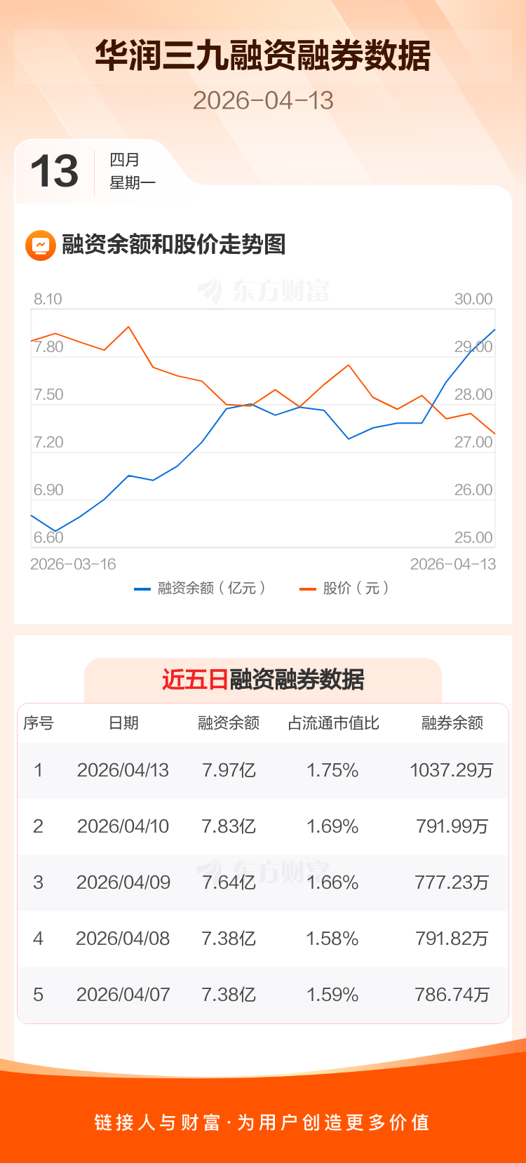 交易所最新数据显示,华润三九于2026年4月13日获融资买入3480.02万元,融资偿还2130.29万元,当日融资净买入1349.73万元。目前,该股融资余额7.97亿,占流通市值比例为1.75%。