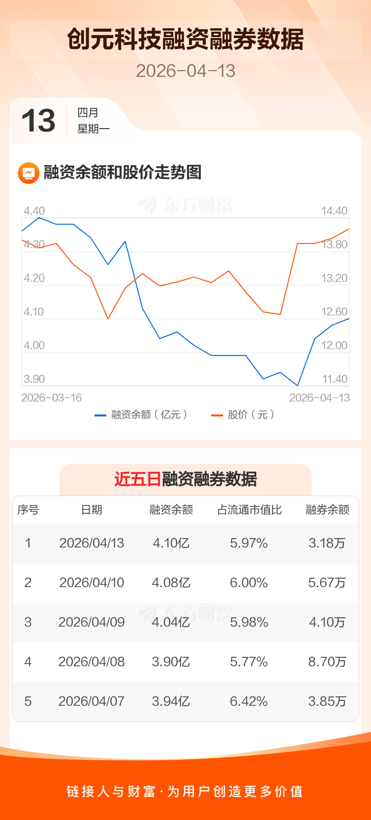 交易所最新数据显示,创元科技于2026年4月13日获融资买入1930.50万元,融资偿还1692.00万元,当日融资净买入238.5万元。目前,该股融资余额4.10亿,占流通市值比例为5.97%。